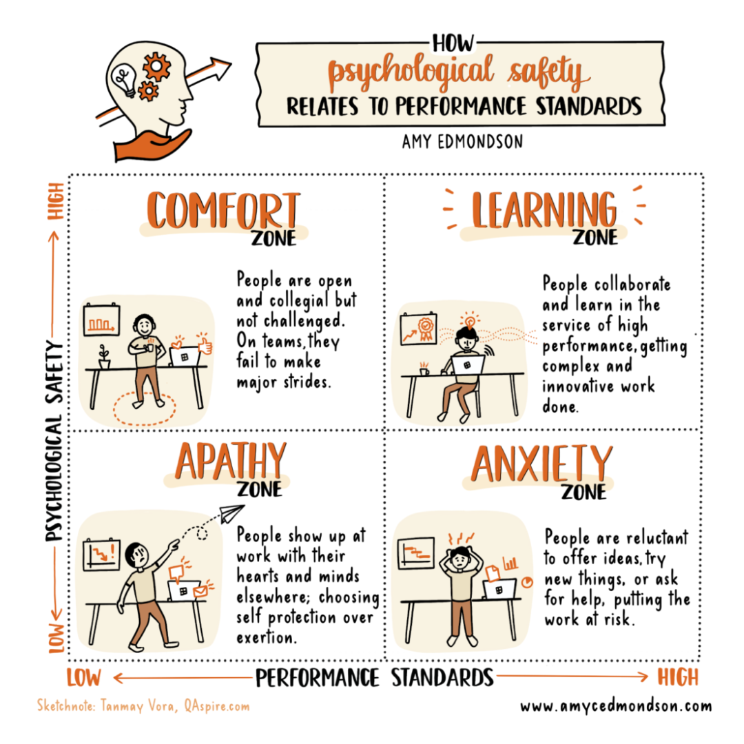 One of Edmondson’s key insights is that psychological safety enables teams to operate in the “Learning Zone,” where high psychological safety meets high responsibility. In this zone, teams are both supported and challenged, enabling them to tackle ambitious goals while continuously improving.